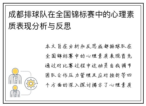 本文旨在分析和反思成都排球队在全国锦标赛中的心理素质表现。首先,通过对比赛过程中运动员自我调节、团队合作、压力管理及应对挫折等四个方面的深入探讨,揭示了心理素质对于竞技体育的重要性。其次,通过具体案例分析,结合理论与实践,指出了成都排球队在这些方面存在的问题与不足之处,并提出相应的改进建议。最后,希望通过本次分析能够为今后成都排球队的训练和比赛提供参考,以进一步提升其整体竞争力,实现更好的成绩。